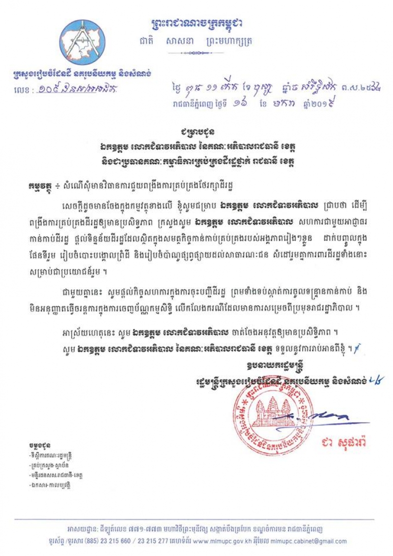 According to a letter dated 16 January, 2019, Deputy Prime Minister H.E Chea Sophara, Minister of MLMUPC requested that the governors of cities and provinces who chair state land management committees provide data on state land so the ministry can include in a comprehensive map to ease management of the resource.