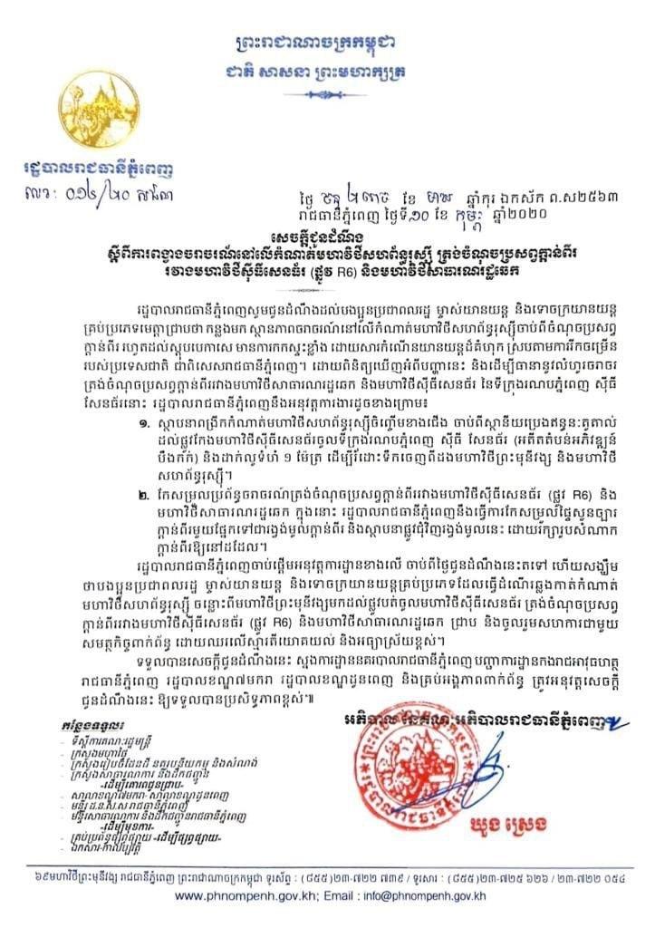 គម្រោងស្ថាបនានេះ គឺចាប់អនុវត្តចាប់ពីថ្ងៃផ្សាយដំណឹងនេះតទៅ ហើយស្នើឱ្យអ្នកធ្វើដំណើរឆ្លងកាត់តំបន់ខាងលើ គួរតែមានការយោគយល់ និងអធ្យាស្រ័យគ្នា៕